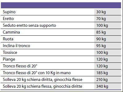 Dal documento riprendiamo uno schema che riassume alcuni livelli di carico sul disco tra la III e la IV vertebra lombare (L3-L4), di un soggetto di 70 kg di peso in diverse posture e condizioni di carico: