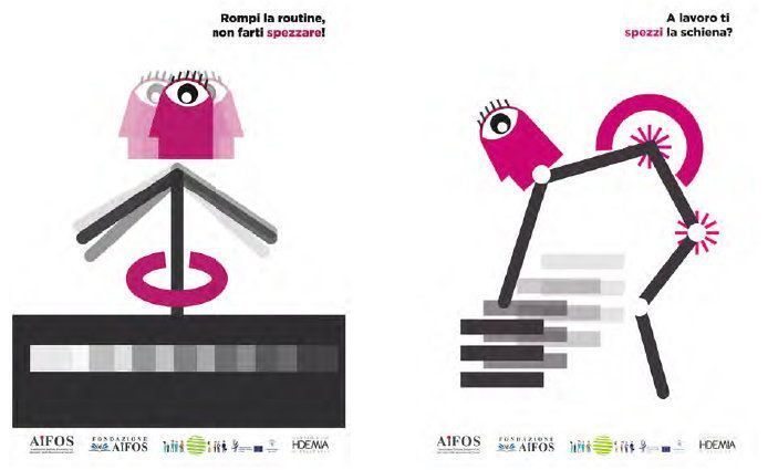 Riprendiamo dall’eBook alcune immagini tratte dai manifesti che sono frutto del progetto “Manifesti per la sicurezza”, ideato da AiFOS e Fondazione AiFOS in collaborazione con gli studenti del corso di Grafica dell’Accademia di Belle Arti Santa Giulia di Brescia. Un progetto che si è sviluppato in occasione della campagna 2020-2022 “ Ambienti di lavoro sani e sicuri. Alleggeriamo il carico!” promossa dall’Agenzia europea per la sicurezza e la salute sul lavoro ( EU-OSHA):