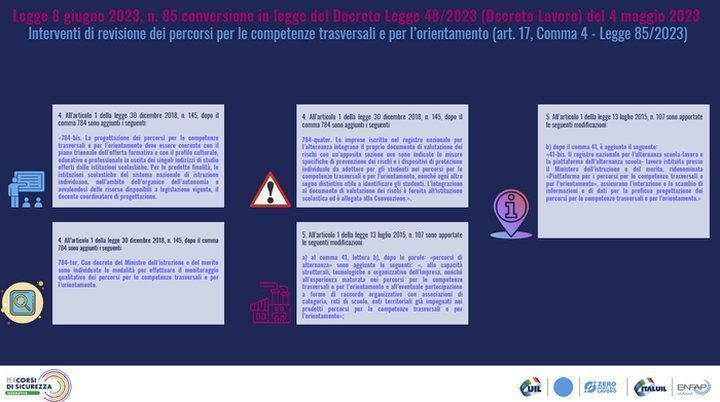 Decreto e successiva conversione in legge a cui abbiamo dato molta rilevanza perchè il Capo II (“Interventi urgenti in materia di rafforzamento delle regole di sicurezza sul lavoro e di tutela contro gli infortuni, nonché di aggiornamento del sistema di controlli ispettivi”) del DL n. 48/2023 contiene sensibili modifiche agli articoli del Decreto Legislativo 9 aprile 2008, n. 81 e altre novità rilevanti riguardo i percorsi di alternanza scuola lavoro (ora PCTO), la vigilanza in materia di salute e sicurezza e il lavoro agile.