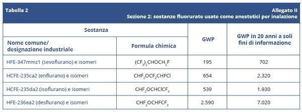 Si indica che i valori di GWP riportati nella tabella per tutti i gas “risultano essere maggiori nel breve periodo (20 anni), rispetto a quelli sul lungo periodo (100 anni)”. E a causa della ‘vita atmosferica del gas’ molti di questi “hanno un effetto di riscaldamento molto intenso, come per esempio il desflurano, utilizzato in alcuni contesti chirurgici, un gas a effetto serra estremamente potente”. E per questo motivo, “dal 1° gennaio 2026 l’utilizzo del desflurano sarà vietato, data la disponibilità di alternative meno potenti, salvo impieghi in applicazioni che rappresentano eccezioni mediche (dalla letteratura scientifica, si evidenziano benefici nell’uso del desflurano nel contesto di interventi neurochirurgici, con un numero stimato di circa 13 milioni di interventi/anno), ma, in questo caso, dovranno essere attuate modifiche degli impianti dei sistemi di erogazione e di evacuazione di tale gas”.