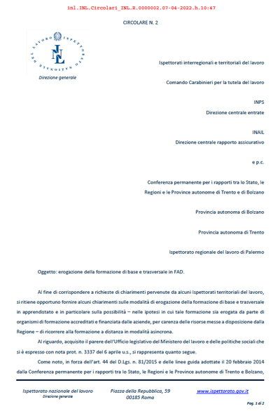 A fornire ulteriori indicazioni sull’utilizzo della formazione a distanza sincrona, anche se limitatamente agli apprendisti, è la recente Circolare n. 2 del 7 aprile 2022 dell’ Ispettorato Nazionale del Lavoro che ha per oggetto: “erogazione della formazione di base e trasversale in FAD”.
