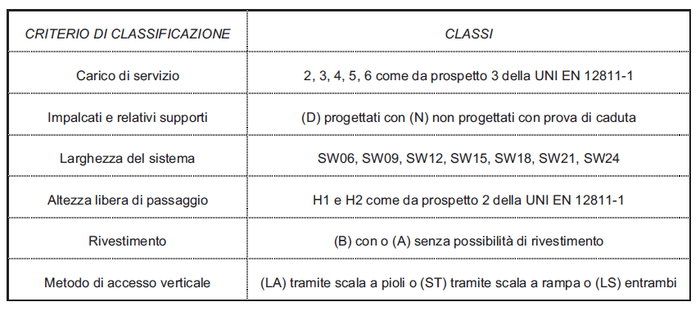 La norma UNI EN 12810-1 classifica il ponteggio in base a vari parametri: “carico di servizio, impalcati e relativi supporti, larghezza del sistema, altezza libera di passaggio, rivestimento e metodo di accesso verticale”. La norma prevede dunque che un ponteggio debba essere classificato in base alle seguenti indicazioni (con riferimento alla tabella che riprendiamo dal documento Inail):