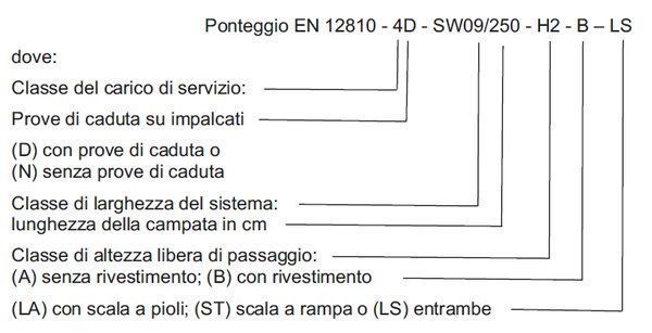 E sempre la norma UNI EN 12810-1 prevede che il ponteggio debba essere designato, mediante una stringa di caratteri alfanumerici, come segue (anche in questo caso prendiamo l’esempio dal documento Inail):
