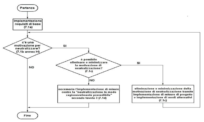 Successivamente il diagramma indica che la norma “richiede di accertarsi se esiste la motivazione alla neutralizzazione in modo ragionevolmente prevedibile, indicando laddove esiste, le misure addizionali da implementare”. Un allegato della norma (allegato H) fa riferimento ai “motivi di neutralizzazione di un dispositivo di interblocco” e fornisce anche una “tabella di esempio per la valutazione di questi motivi delle macchine automatiche (example for automatic machine tool)”, un metodo di valutazione che parte dai seguenti presupposti:
