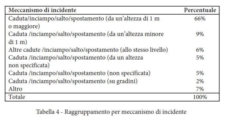 - “gli infortuni avvengono principalmente per cadute da scale da altezze superiori a un metro e che la maggior parte delle lesioni interessa gli arti inferiori e superiori, dove la frattura e la contusione sono quelle di maggiore frequenza. Tuttavia anche da altezze relativamente basse si ottengono lesioni di consistente gravità”.