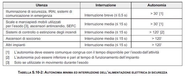 - “gli impianti di cui al paragrafo S.10.1, che abbiano una funzione ai fini della gestione dell’emergenza, devono disporre di alimentazione elettrica di sicurezza con le caratteristiche minime indicate nella tabella S.10-2” (tutti i sistemi di protezione attiva e l’illuminazione di sicurezza, “devono disporre di alimentazione elettrica di sicurezza”);