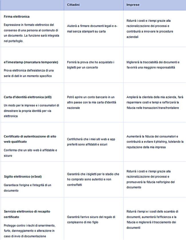 I seguenti servizi di identificazione e fiduciari possono già essere utilizzati con effetto giuridico in tutta l'UE grazie al quadro di fiducia creato dal regolamento eIDAS. Si tratta di strumenti fondamentali per garantire la fiducia e la sicurezza nel mercato unico digitale. Alcuni servizi, come le firme elettroniche, saranno integrati nel portafoglio per facilitarne l'uso.