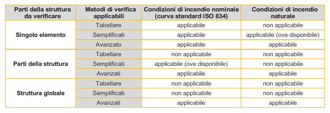 Si segnala che nell’ambito del quadro normativo, con riferimento ai soli elementi strutturali, “la verifica analitica in condizioni di incendio può essere effettuata secondo tre approcci differenti, contraddistinti da diversi livelli di complessità”: