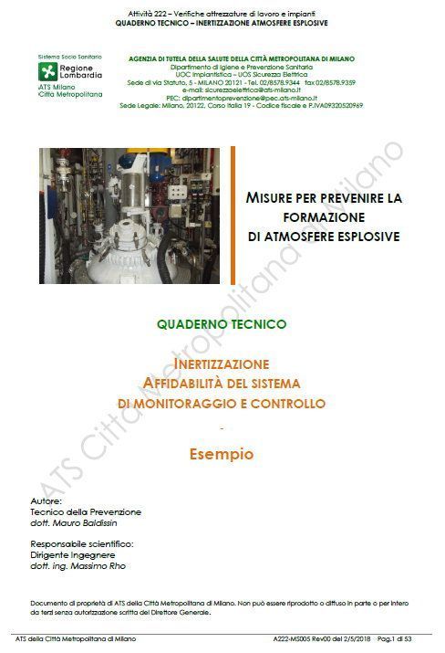 ATS della Città Metropolitana di Milano, “Inertizzazione - affidabilità del sistema di monitoraggio e controllo - Esempio”, quaderno tecnico relativo alle “Misure per prevenire la formazione di atmosfere esplosive”, a cura del dott. Mauro Baldissin (Tecnico della Prevenzione) e con la responsabilità scientifica del dott. ing. Massimo Rho, Atex, Attività 222 – Verifiche attrezzature di lavoro e impianti, A222-MS005 rev00 del 02/05/2018.