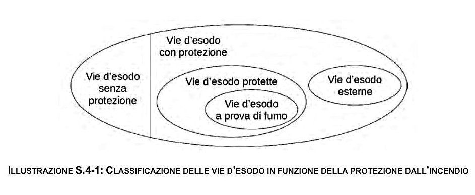 - Via d'esodo (o via d'emergenza): “percorso senza ostacoli al deflusso appartenente al sistema d'esodo, che consente agli occupanti di raggiungere un luogo sicuro dal luogo in cui si trovano”.
