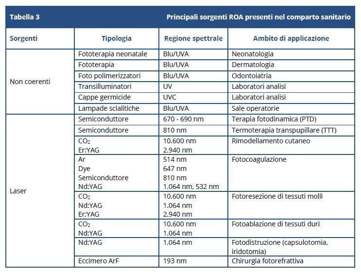 Il documento indica che le sorgenti di radiazioni ottiche artificiali. (ROA) utilizzate nel comparto sanitario sono riportate nella Tabella 3, che riprendiamo, suddivise tra sorgenti non coerenti e coerenti (laser).