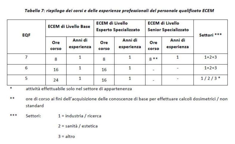 Infine riguardo al mantenimento delle competenze si indica che la persona qualificata ECEM di Livello Base, di Livello Esperto Specializzato, di Livello Senior Specializzato “è tenuta all’aggiornamento professionale con la frequenza di corsi di formazione in materia di salute e sicurezza nel settore dei CEM”.
