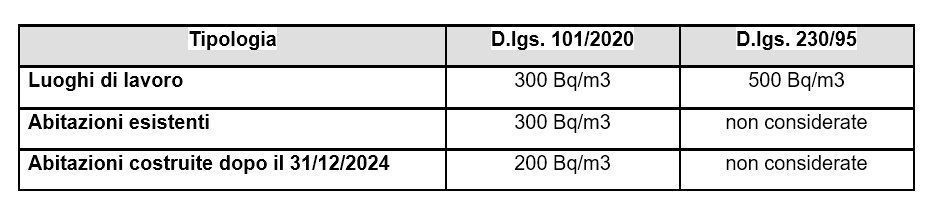 In particolare l’art. 12 del D.lgs. 101/2020 fissa i livelli di riferimento della concentrazione media annua di attività di radon in aria sia per i luoghi di lavoro sia per le abitazioni.