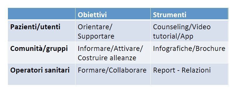 - “sviluppo di consapevolezza, cultura condivisa, conoscenza dei problemi (rischi per la salute, danni), capacità di partecipazione alle scelte”.