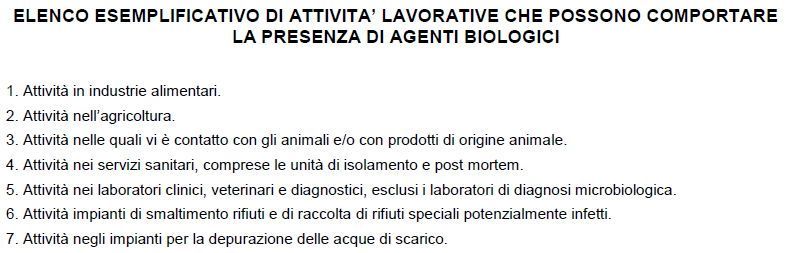 E ci sono anche altre attività con una “potenziale” esposizione ad agenti biologici: “zootecnia; macellazione carni; piscicoltura; industria di trasformazione di derivati animali (cuoio, pelle, lana ecc.); servizi mortuari e cimiteriali; impianti industriali di sterilizzazione, disinfezione e lavaggio di materiali potenzialmente infetti (lavanderie, ecc.); falegnamerie; industria edile e delle costruzioni; imprese di pulizia; operatori scolastici; parrucchieri ed estetisti; tatuatori; attività lavorative aeroportuali; attività di assistenza ai bagnanti; industria farmaceutica (vaccini-prove biologiche); industria delle biotecnologie (produzione di microrganismi selezionati); industria bellica; miniere (uso di microrganismi per la concentrazione dei metalli in soluzioni acquose)”.
