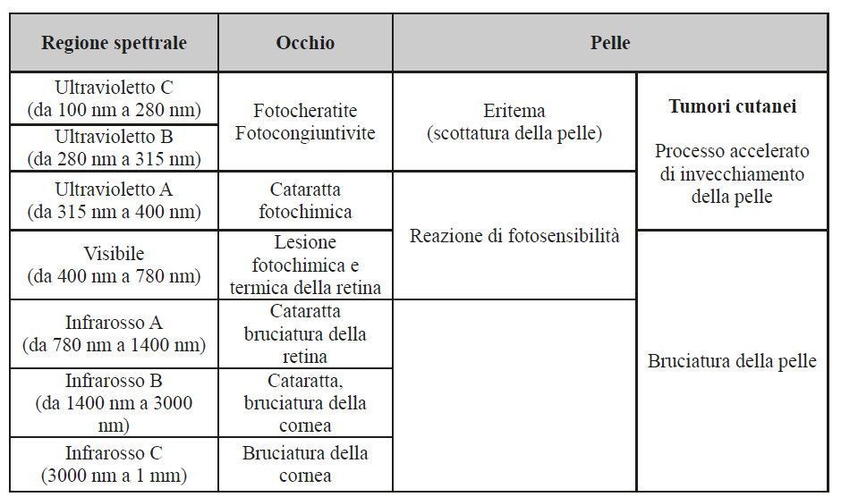 Si segnala, a questo proposito, che gli effetti dell’esposizione “dipendono dalla lunghezza d’onda della radiazione incidente, mentre dall’intensità dipendono la possibilità che questi effetti si verifichino e/o la loro gravità”.