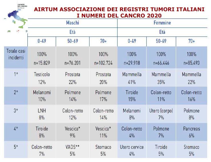 A questo proposito sono presentati dei dati raccolti dall’Associazione Italiana Registri Tumori ( AIRTUM) che riporta alcune stime relative al 2020 sulla base dei dati di popolazione raccolti dai Registri Tumori Italiani.