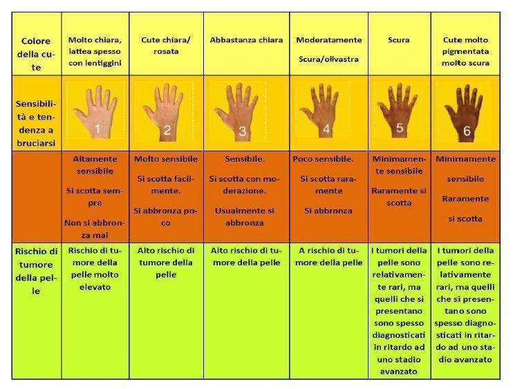 In particolare il fototipo di ogni individuo “riassume in sé alcune caratteristiche individuali che possono determinare un maggior rischio. Diverse sono le sfumature di colore della cute, da cui dipende il grado di protezione naturale dai raggi del sole cui si associa inoltre la capacità o meno di abbronzarsi o di scottarsi: questi sono gli elementi costitutivi alla base della classificazione schematica proposta da Fitzpatrick. I fototipi 1 e 2, rappresentativi di una cute molto chiara, sono i più sensibili ai danni UV sia per gli effetti acuti che a lungo termine, ma anche i fototipi 3 e 4 non sono esenti dal rischio”.