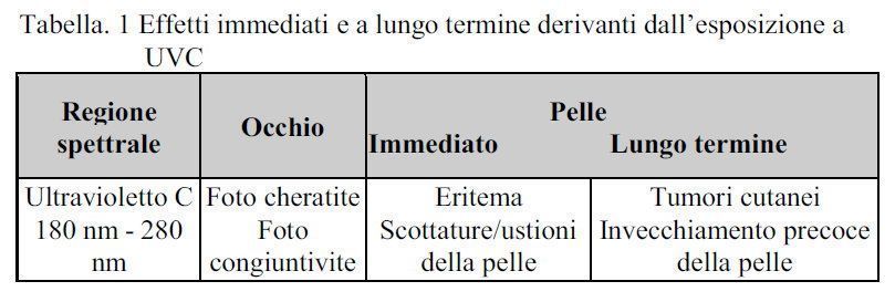 Tuttavia è importante ricordare che “tutta la radiazione ultravioletta nelle sue componenti UV-A, UV-B ed UV-C è classificata dalla Agenzia Internazionale per la Ricerca sul Cancro (IARC) nel Gruppo l degli agenti certamente cancerogeni per l'uomo”. In particolare i danni indotti a livello degli occhi e della cute (Tabella l) “possono avvenire con tempi molto brevi di esposizione (nell'ordine di pochi secondi in presenza di lampade UV-C non schermate): per questo motivo, l'utilizzazione degli UV-C con attività germicida negli ambienti di lavoro deve avvenire nel rispetto di ben precisi protocolli di sicurezza, elaborati a seguito della valutazione del rischio, come prescritto dal D.lgs. 81/08 Titolo VIII Capo V”. Si ricorda che alla luce della crescente “diffusione dell'impiego delle lampade germicide a seguito della pandemia COVID-19, anche in ambienti ed attività produttive ove tale impiego non era in passato abituale”, il Gruppo Tematico Agenti Fisici del Coordinamento Tecnico Interregionale Salute e Sicurezza nei Luoghi di Lavoro, nell'ambito della revisione delle Linee di Indirizzo sulla valutazione del Rischio ROA, ha inserito una FAQ specifica dedicata ai criteri da applicarsi nella valutazione e prevenzione del rischio derivante dall'esposizione a radiazione UVC prodotta dalle Lampade Germicide”.