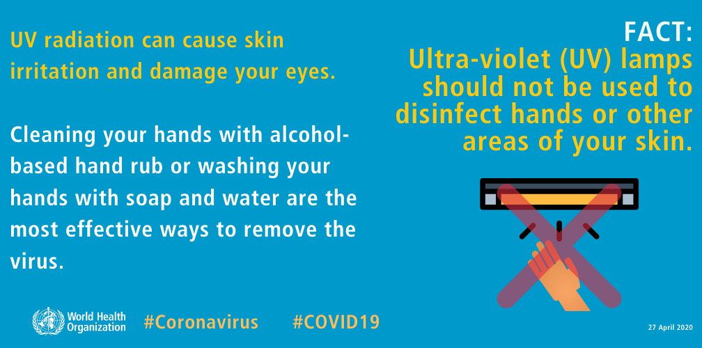 L'Organizzazione Mondiale della Sanità (WHO) ha dedicato una info-grafica ed un breve video sui possibili rischi per la salute dovuti all'esposizione alle lampade, “manifestando il timore che potessero essere utilizzate per la sterilizzazione delle mani ed esporre in ogni caso l'utilizzatore ai danni a carico di occhi e cute”.