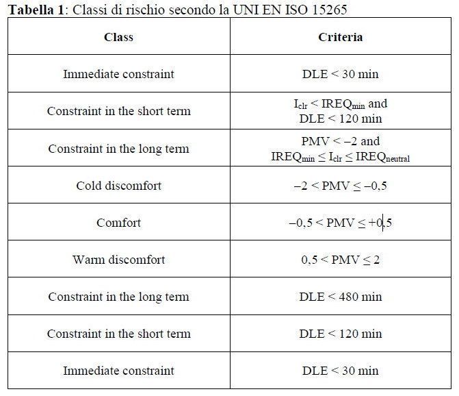 In particolare riguardo alla fase denominata “analisi”, la norma indica che “questa si deve condurre con una valutazione multi-indice delle condizioni microclimatiche per giungere a una classificazione del rischio che individua nove possibili categorie”.