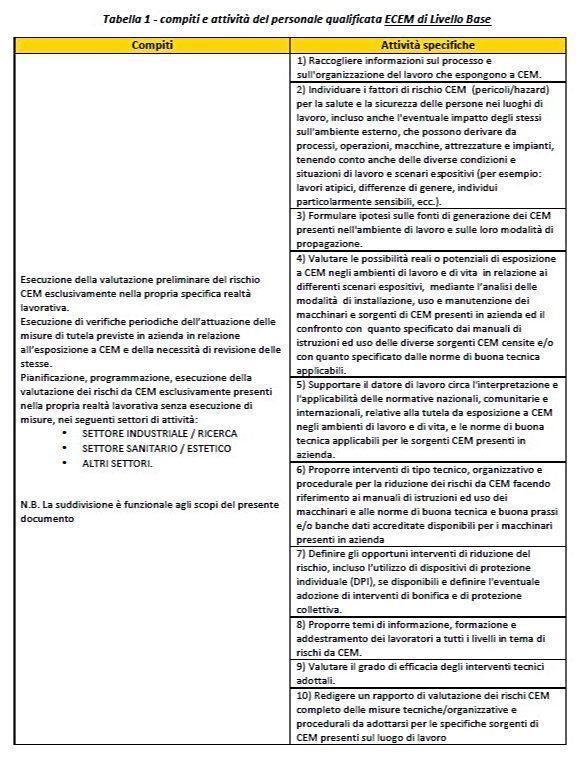Riguardo alla tabella 2 ricordiamo che un compito della persona qualificata al Livello Esperto Specializzato è relativo alla “pianificazione, programmazione, effettuazione di misurazioni per la valutazione dell’esposizione a CEM qualora questa necessiti di misurazioni”.