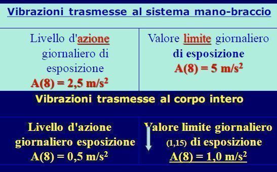 Inoltre il valore limite di esposizione su periodi brevi per le vibrazioni trasmesse al sistema mano-braccio è pari a 20 m/s2, mentre per le vibrazioni trasmesse al corpo intero è pari a 1,5 m/s2.