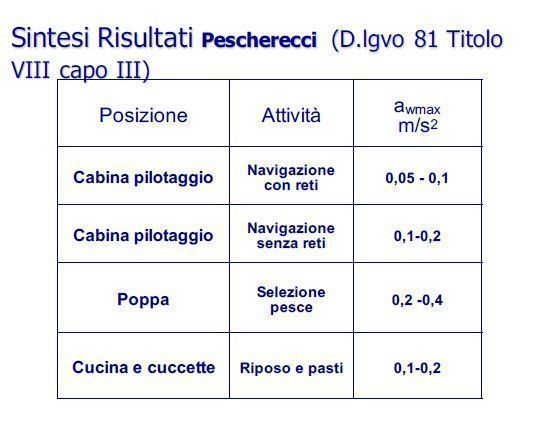 Si riportano informazioni sulle vibrazioni a bordo di pescherecci con riferimento ad alcune ricerche. Riprendiamo un grafico presente nelle slide: