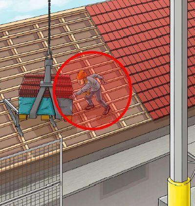 Un lavoratore, falegname qualificato, “sta lavorando sul tetto spiovente di un edificio in costruzione. Arriva presto sul posto per svolgere dei lavori preliminari. L’intenzione è di sollevare sul tetto una paletta di tegole con una gru.