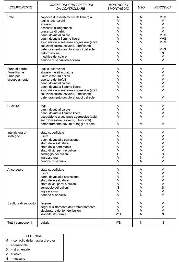 - ispezione periodica: “la rete di sicurezza deve essere ispezionata ad intervalli raccomandati dal fabbricante ed al massimo ogni anno. Lo stato della rete deve essere verificato periodicamente insieme ai sistemi e dispositivi di ancoraggio controllando anche lo stato tensionale e rimuovendo i detriti caduti sulla rete stessa. L’ispezione periodica deve essere effettuata dal fabbricante o dal manutentore autorizzato dal fabbricante, con assunzione di responsabilità”. Il controllo “deve essere di tipo visivo e/o strumentale”. Nel caso siano rilevati difetti o inconvenienti “deve essere effettuata l'ispezione straordinaria”. Inoltre al fine di garantire l’ispezione periodica annuale della rete di sicurezza “essa deve essere provvista di almeno una maglia di prova infilata tra le maglie della rete ed attaccata nell’area del bordo. Essa deve provenire dallo stesso lotto di produzione della rete e deve essere identificata come la rete al fine di garantire l’origine della maglia stessa. La funzione della maglia di prova è quella di garantire che la rete abbia una resistenza all’invecchiamento di almeno un anno”;