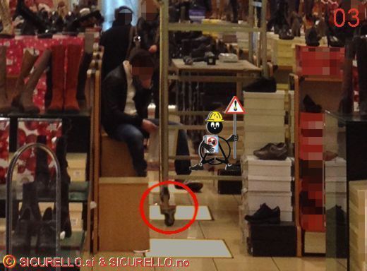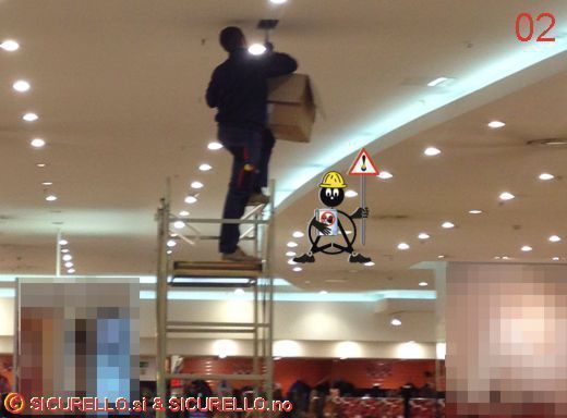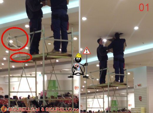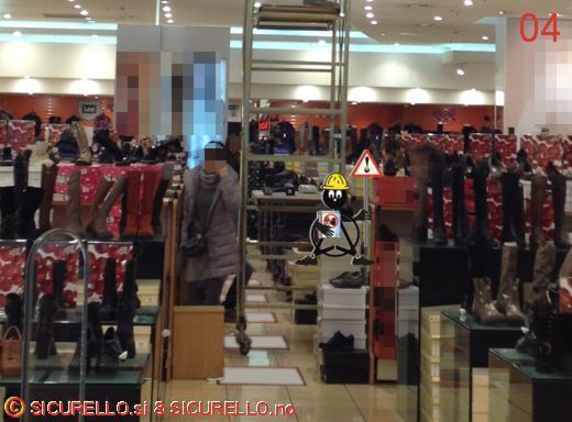 - non è presente alcuna delimitazione e/o segnalazione delle aree di lavoro, tant’è che alcuni clienti sostano e passano tranquillamente nel corridoio dove è posizionato il trabattello affiancandosi ad esso (foto 03 - 04),