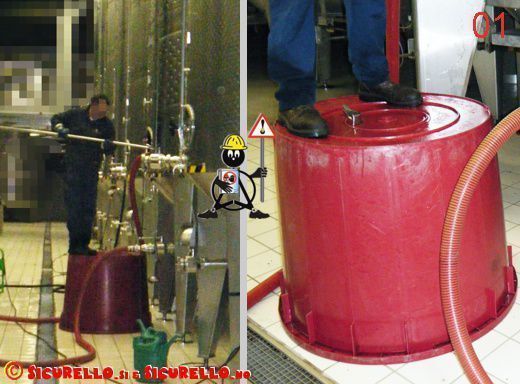 Durante i lavori di lavaggio di alcuni serbatoi l’operatore, anziché utilizzare le apposite piattaforme in dotazione, ha optato per il rovesciamento di un “mastello per il vino” (tino) posizionandosi su di esso.