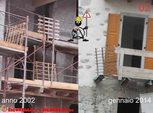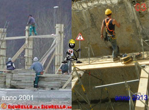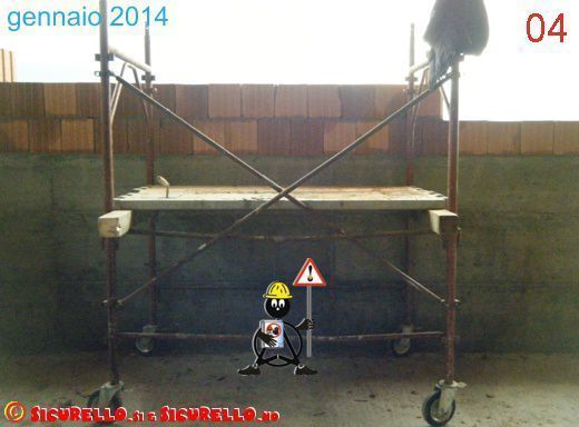 Ed è proprio da questa speranza (disattesa) che si sviluppa la carrellata di immagini di oggi, con un confronto tra alcune situazioni di lavoro fotografate più di dieci anni fa e situazioni simili fotografate negli ultimi mesi. Nel frattempo molto sarebbe dovuto cambiare, ma in realtà molto deve ancora cambiare. Gli impianti elettrici sono ancora utilizzati scorrettamente (foto 01), i pallet dei mattoni servono ancora come parapetti (foto 02), gli operai lavorano sempre in quota senza proteggersi (magari ora indossano l’imbrago, ma poi non si ancorano da nessuna parte – foto 03). Ed infine (gennaio 2014) per qualcuno il “ ponte su ruote” è ancora un ponteggio tradizionale al quale vengono applicate le ruote (per non parlare di come è stato “assemblato” – foto 04).