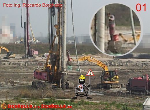 Proprio durante una fase di lavoro legata a delle “fondazioni speciali”, probabilmente a seguito di un guasto, o per effettuare un controllo dell’attrezzatura, il manutentore viene trasportato in quota posizionato sul retro del cucchiaio della benna di un escavatore.