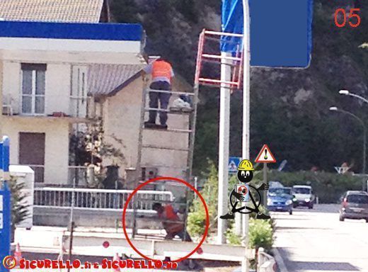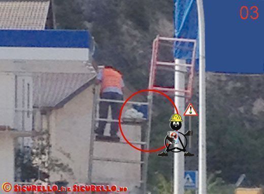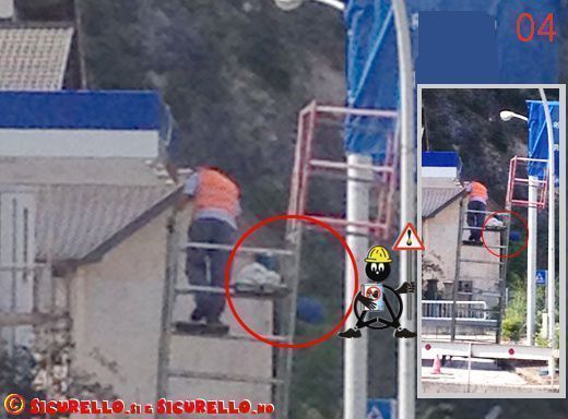 Già questo poteva bastare per chiedersi se qualcuno (un datore di lavoro, un preposto od altro soggetto) stessero verificando l’attività svolta e se il lavoratore fosse stato formato, informato ed addestrato e soprattutto fosse consapevole dei rischi che stava correndo, ma poi la situazione è proseguita con l’operaio che appoggiandosi alla pensilina ha provato a far spostare il trabattello (classica manovra che oltre ad essere vietata dalle norme è – vista l’altezza e la scarsa stabilità/verticalità - anche e soprattutto da incoscienti) [foto 02].