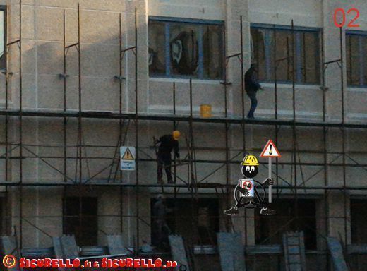 Le fotografie non hanno bisogno di commento. Le situazioni di pericolo con un elevato rischio di caduta dall’alto da oltre 6 metri, sono talmente evidenti che non serve aggiungere nulla (possiamo solo ipotizzare come sia stata eseguita la lavorazione di smontaggio degli impalcati superiori e la cosa non ci rassicura).
