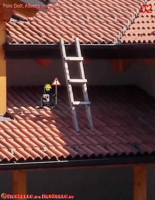 Se a questo aggiungiamo la posizione di installazione della scala, il cui utilizzo – almeno all’apparenza – sembrerebbe quello di permettere il transito tra due falde di tetto sovrapposte, combinata con l’assenza – almeno così sembra dall’analisi delle fotografie – di idonei e specifici punti di ancoraggio per D.P.I. anticaduta, la conclusione non può che far rabbrividire.