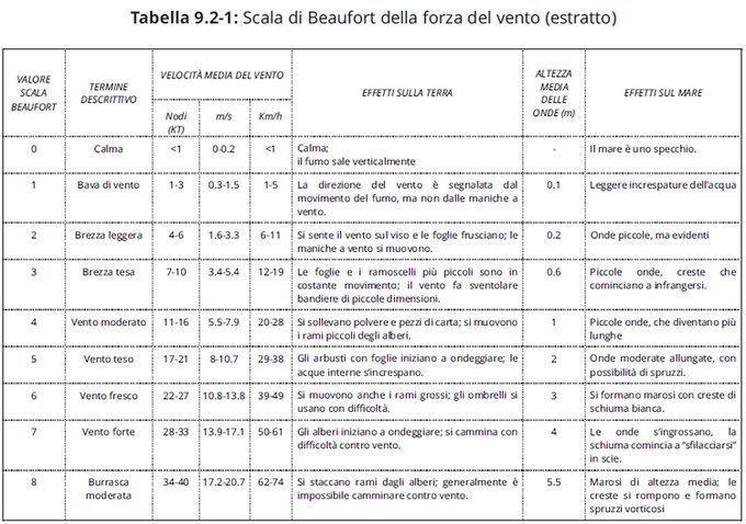 Riprendiamo dal documento un estratto della scala di Beaufort: