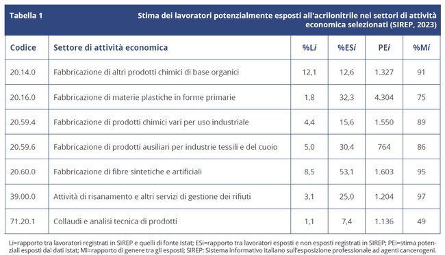 Il documento ricorda che “la stima nazionale di lavoratori potenzialmente esposti ad acrilonitrile (PEi) per l’i-esimo settore di attività economico (i) è stata realizzata applicando la percentuale (%ESi) dei lavoratori esposti rispetto al totale dei lavoratori (esposti + non esposti) notificati dalle aziende all’Istituto (fonte SIREP), alla popolazione lavorativa totale in Italia di fonte Istat (censimento 2011)”.