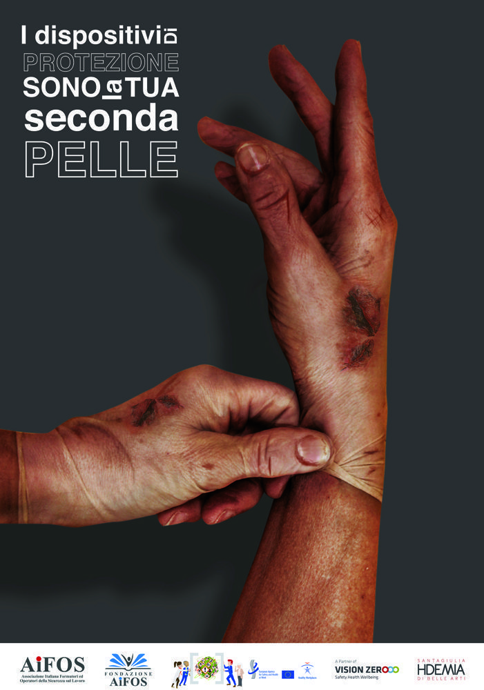 Due mani apparentemente ferite e segnate sono le protagoniste di questo manifesto. Su un neutro sfondo grigio scuro, la mano sinistra sta ultimando di indossare un guanto sulla mano destra, distesa perché la protezione calzi al meglio. Il guanto però è fatto della stessa pelle della persona. Con un gioco potente e al contempo sottile di trasparenze visive e di significati l’autrice ci mostra come sarebbero le mani del lavoratore se non si fosse protetto con gli appositi dispositivi di protezione. È un concetto applicabile a diversi rischi, tra cui le sostanze pericolose, dalle quali ci si può proteggere con una “seconda pelle”, per poter così mantenere in salute la prima. Il modo di dire “salvare la pelle” si manifesta in modo efficace in questa rappresentazione.