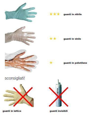 - guanti in polietilene: guanti usa e getta economici, si strappano facilmente e non offrono adeguata protezione ai polsi, taglia unica;