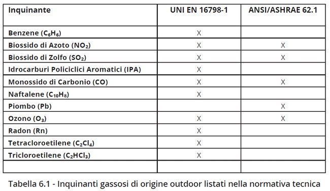Riguardo agli inquinanti che arrivano dall’esterno, il documento indica che “le due principali norme tecniche relative alla qualità dell’aria indoor presentano due approcci chiaramente distinti: da una parte la tabella B.21 della norma UNI EN 16798-1 contiene una lista di dieci sostanze (o gruppi di sostanze come gli IPA), di prevalente origine outdoor. Dall’altra, la tabella E.1 dello standard ANSI/ASHRAE 62.1 è invece assai più contenuta e limita a cinque le sostanze listate”.