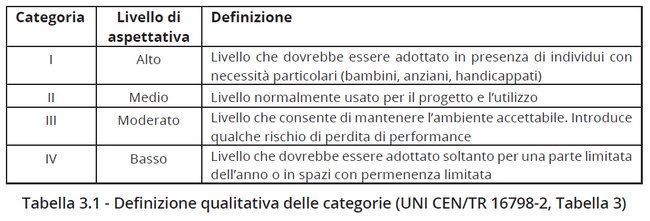Ricordiamo che la descrizione delle categorie, con riferimento al contenuto della norma UNI CEN/TR 16798-2, avviene nel capitolo 3 sui criteri di classificazione. Riportiamo dal documento una tabella: