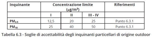 La tabella 6.3 sintetizza le soglie di accettabilità sulle concentrazioni del particolato ricavate nel documento:
