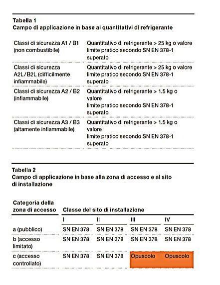 - “per i sistemi di refrigerazione che utilizzano refrigeranti combustibili delle classi di sicurezza A3/B3, l’operatore deve elaborare” – sempre con riferimento alla normativa elvetica – “un documento sulla protezione contro le esplosioni che include un piano delle zone per il sito di installazione”;