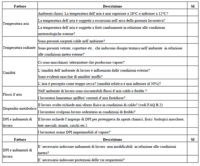 E per individuare in via preliminare la presenza/assenza di criticità relative al microclima in una attività lavorativa, “a prescindere dalla tipologia di attività e dal fatto che essa sia effettuata all’aperto o al chiuso”, può essere usata una lista di riscontro che riprendiamo dal documento: