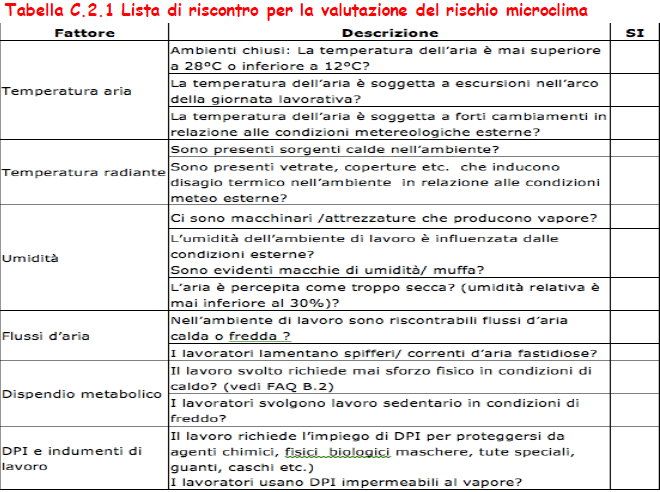Si indica che “al fine di individuare in via preliminare la presenza/assenza di criticità relative al microclima in una attività lavorativa” può essere usata una lista di riscontro.