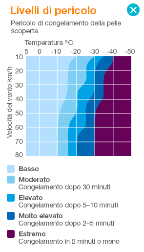 Ulteriori informazioni per datori di lavoroLavorare con il vento e il freddo comporta seri pericoli e aumenta il rischio di infortuni. Informatevi per tempo sulle condizioni meteo e adottate misure di protezione per il personale che lavora frequentemente all’aperto. Mettete a disposizione del personale indumenti resistenti alle intemperie e garantite pause regolari per riscaldarsi in locali per le pause riscaldati. Le prescrizioni di legge sono riportate nell’opuscolo SECO «Lavorare al freddo». Cos’è il windchill e perché è pericoloso?Il fattore windchill è la differenza tra la temperatura dell’aria effettiva e il freddo percepito che viene amplificato dal vento. Questa «temperatura percepita» è spesso molto più bassa di quella misurata. In particolare durante i lavori al freddo all’aperto, ovvero durante tutte le attività in cui il personale è esposto a temperature inferiori a +10 °C, il windchill aumenta il rischio di ipotermia e congelamento. Calcolare il windchillSe la temperatura dell’aria è di +10 °C e il vento soffia a una velocità di 30 km/h, la temperatura percepita è di circa +6 °C. Volete calcolare da soli il windchill attuale? Non dovete fare altro che spostare nel grafico il cursore della temperatura e del vento (in basso nella figura) e in alto a destra sarà visualizzata la temperatura percepita." ![]() |