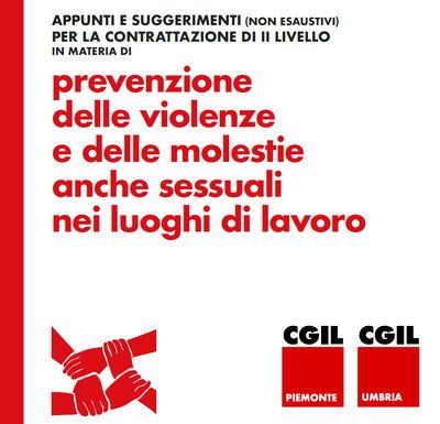 Un documento prodotto da Cgil Piemonte e Cgil Umbria si sofferma sulla prevenzione delle violenze e delle molestie anche sessuali nei luoghi di lavoro. Le definizioni, le conseguenze, i rischi psicosociali e gli ambiti fisici, psicologici e sessuali.