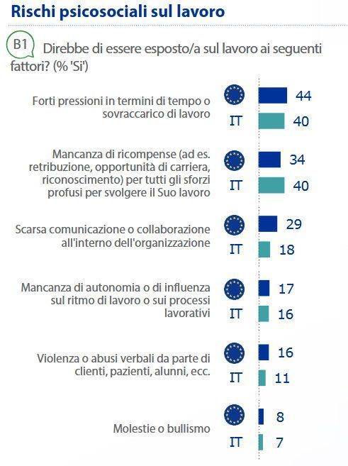 Si indica che più di quattro lavoratori su dieci nell'UE (44%) riferiscono di essere esposti a forti pressioni temporali o a un sovraccarico di lavoro. E circa uno su tre (34%) riferisce una mancanza di “ricompense” (retribuzione, opportunità di carriera, riconoscimento, …) per gli sforzi profusi nel proprio lavoro, seguito dal 29% che segnala una scarsa comunicazione o cooperazione all'interno della propria organizzazione.